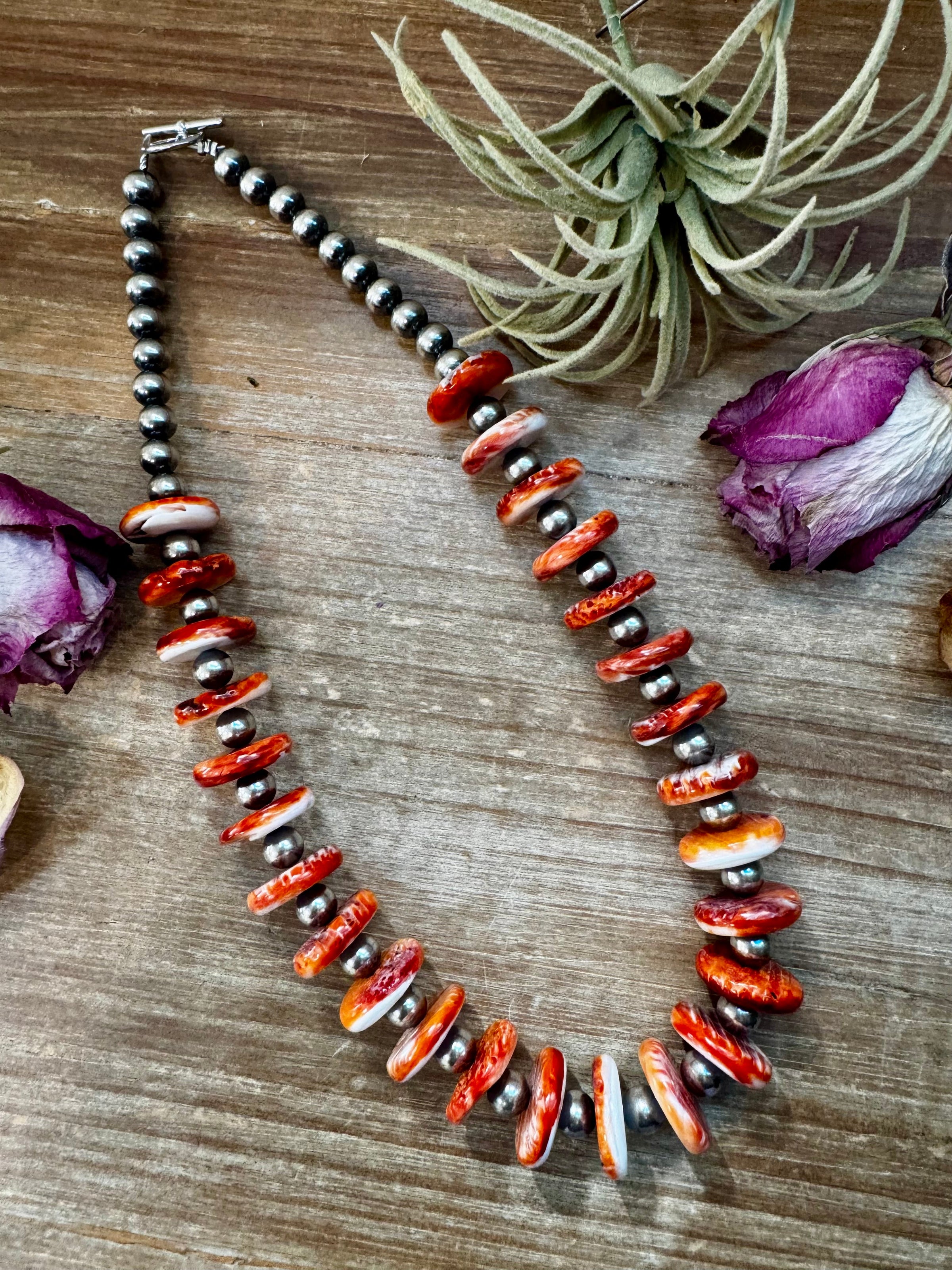 From our exclusive NFR Collection, this handcrafted necklace by The Bijoux FAB is a timeless mix of color and shine. It features 8mm sterling silver pearls with a striking 16mm spiny oyster rondelle centerpiece, rich in natural orange and coral tones. Measuring 20 inches long and finished with a non-tarnish hook, this piece is slightly smaller than most in the collection — perfect for layering with longer necklaces or wearing solo for a subtle Western touch. Only one was made.