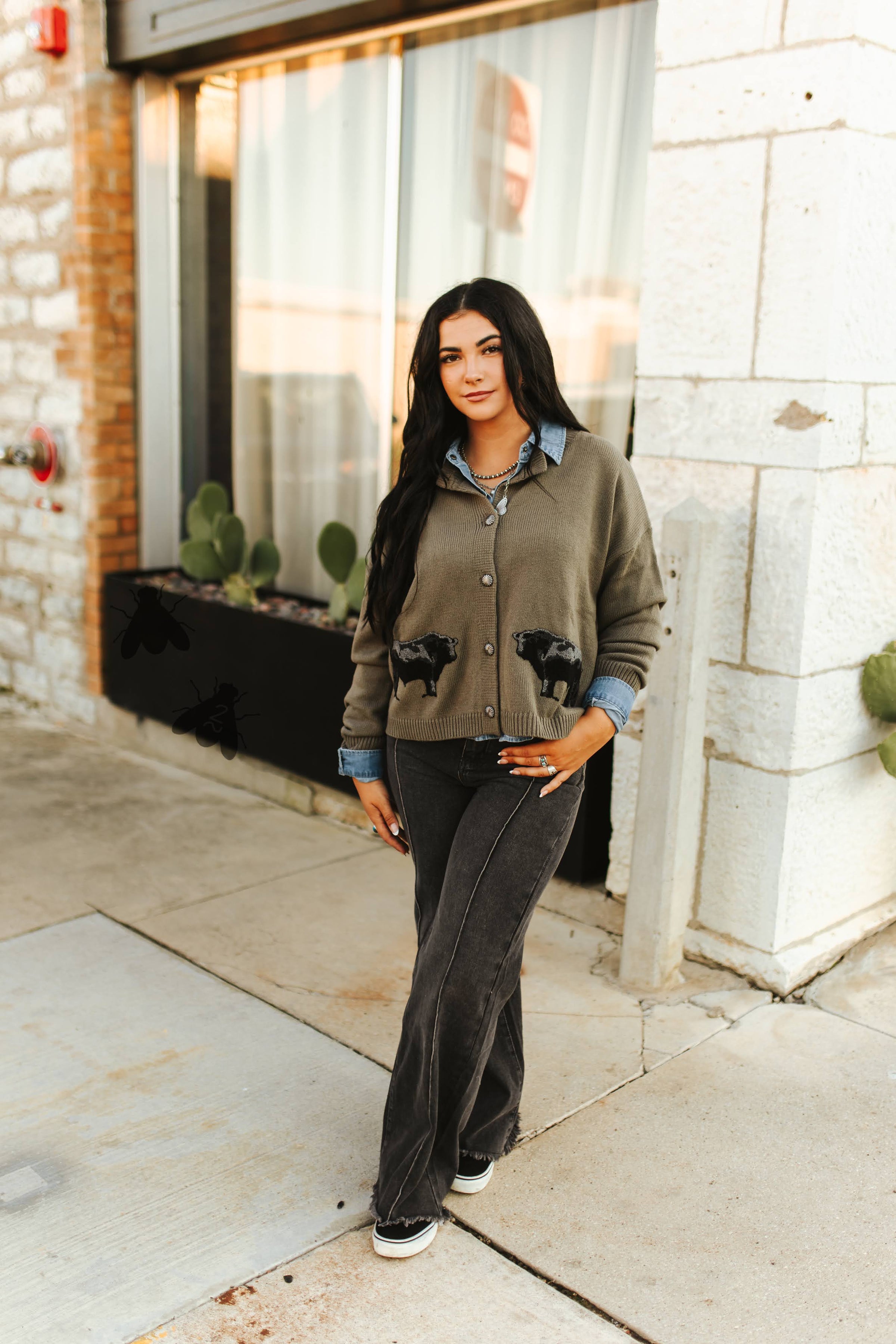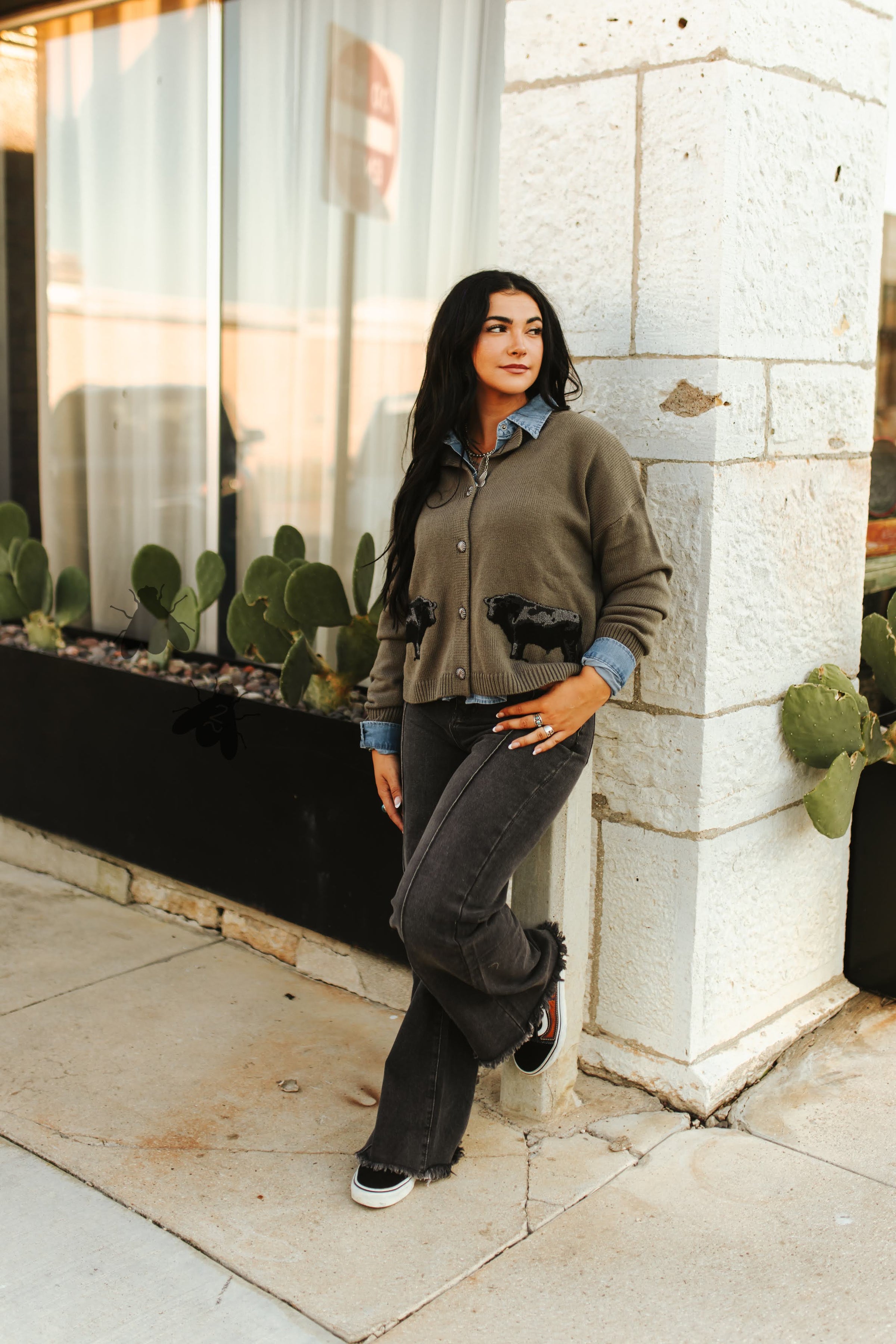 taupe cardigan with some angus patches... we are in LOVEEE.