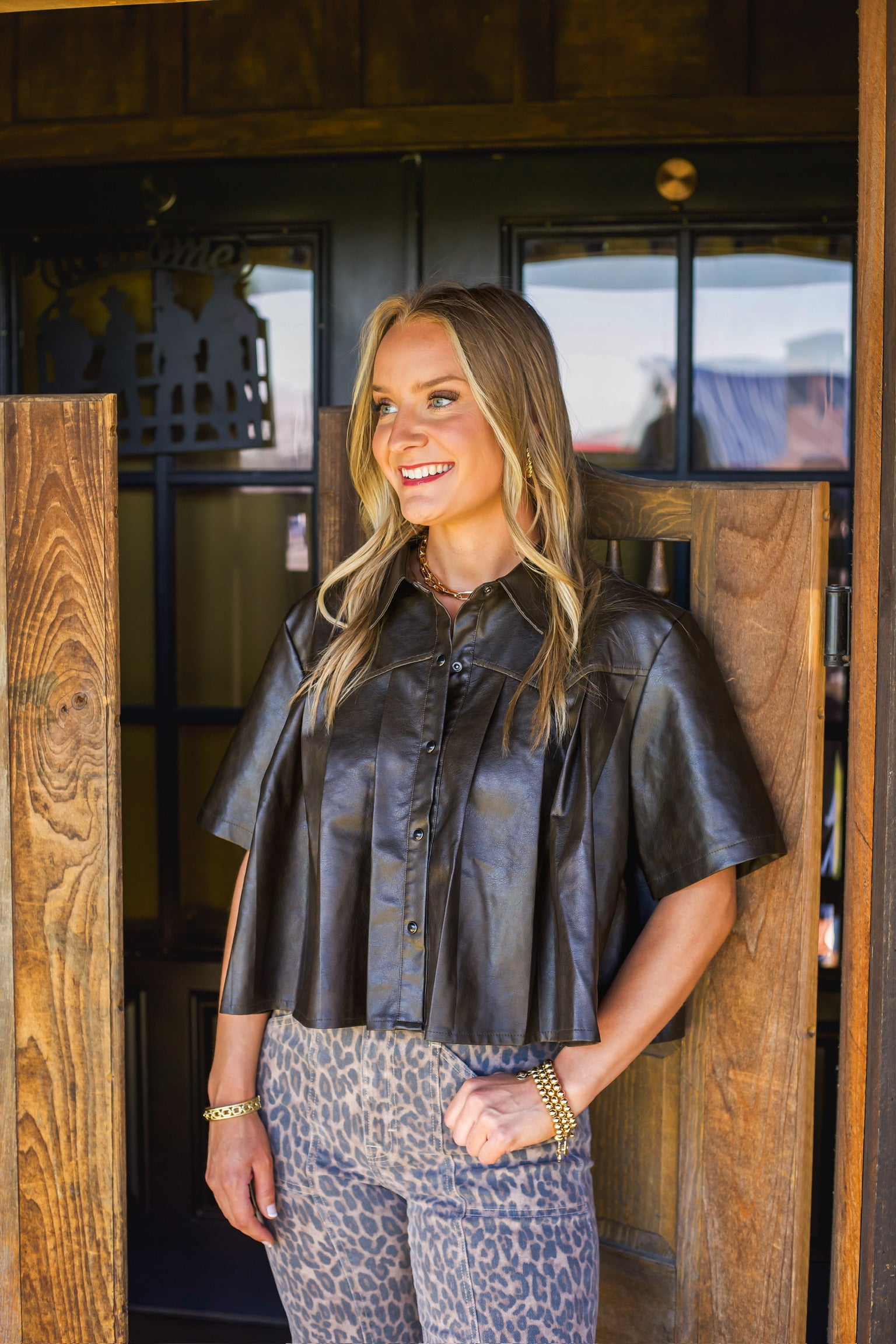 Mocha Pleated Faux Leather Pearl Snap Top