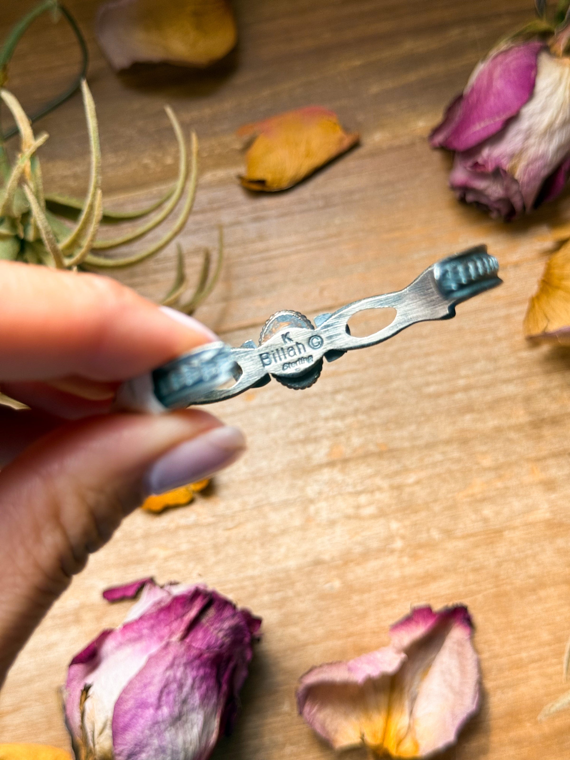 This Native made sterling silver cuff bracelet is handcrafted by artist K. Billah and set with a genuine Kingman turquoise stone. Each cuff showcases detailed silverwork, natural turquoise variation, and timeless Southwestern character. Stamped “Sterling” and proudly handmade in the USA, every piece is one of a kind — pick your cuff to find the one that speaks to you. A stunning collectible with craftsmanship you can feel in every detail.
